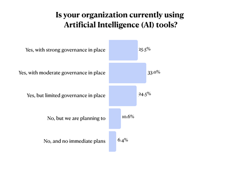 More than 83 percent of respondents to a new Compliance Week and konaAI survey report using artificial intelligence (AI) but only about 25 percent say their organizations have implemented a strong governance framework.